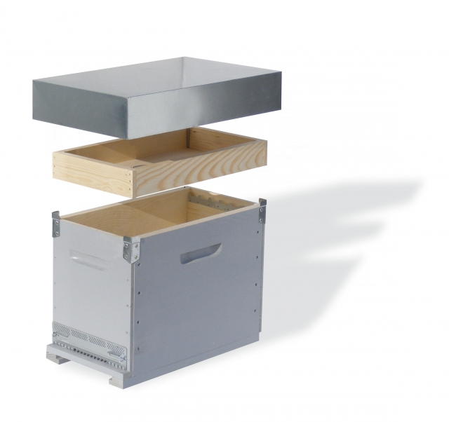 6 Dadant Waben mit antivarroa Boden, nur Brutraum, innendeckel, mit Metallscheibe mit 4 Positionen und Deckel aus verzinktem Blech