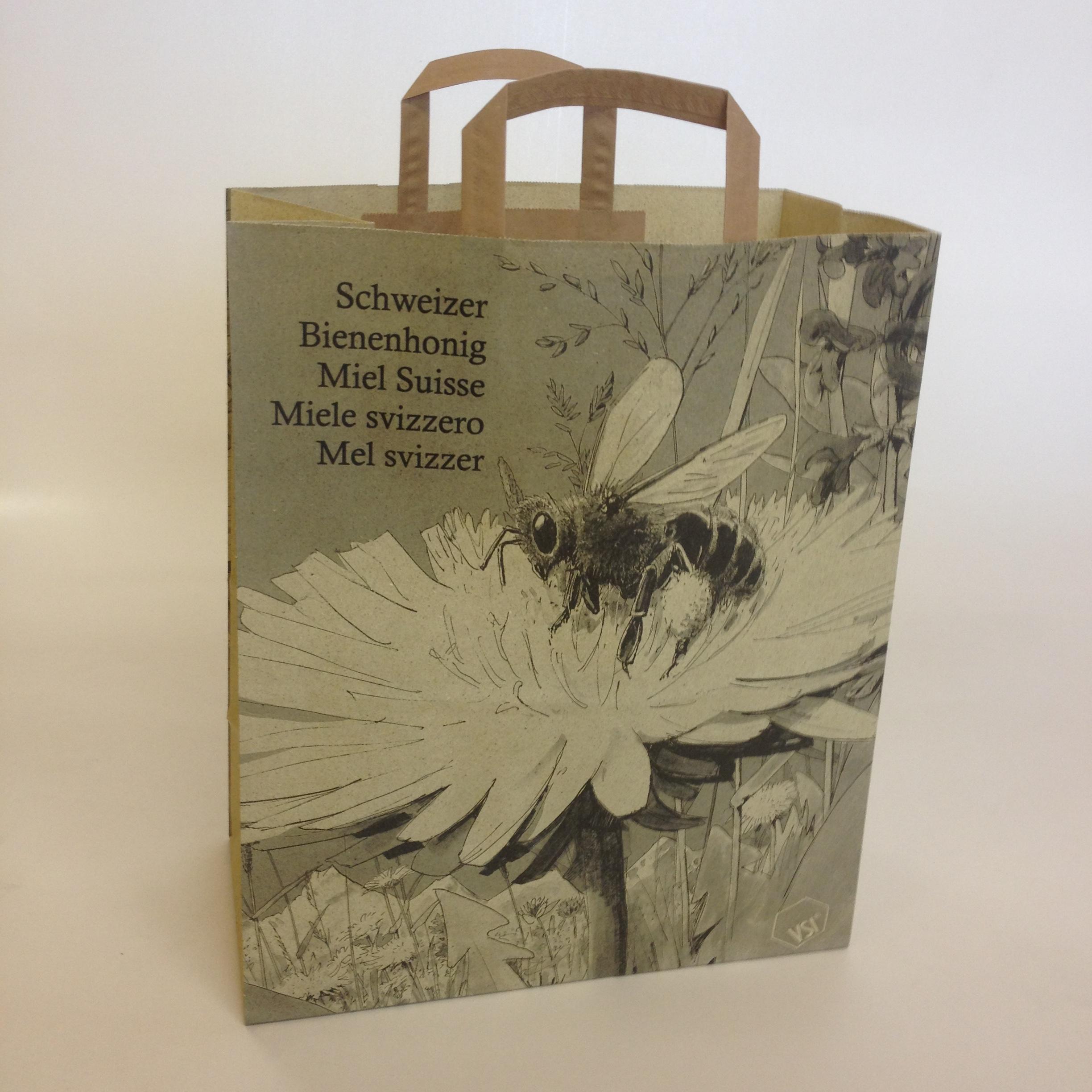 Die praktischen Honigtragtaschen nützen jenen, die ihren Honig an der Haustüre oder am Marktstand feil bieten. Ihre Honigkunden freuts, weil sie auf der Rückseite Informationen über die Honiggewinnung oder die Blütenbestäubung finden. Sie erhalten diese Tragtaschen zum Selbstkostenpreis bei Ihrem VSI-Fachgeschäft.